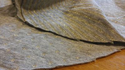 I thought gold lace would be perfect to set off the stripes and dots in the shirt I planned on making from my new fabric. Well, unfortunately, my favorite thrift store had no garments with gold lace that would work for my plan. Dang. There was, however, this shirt.