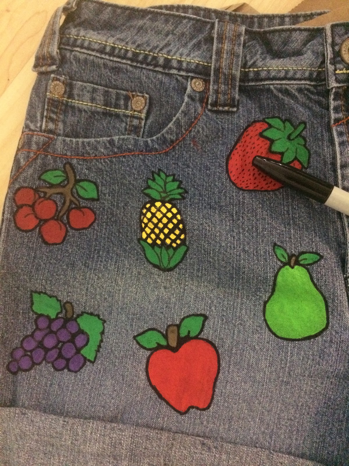 This is part two of my shorts refashion! So I'll just jump right into it! I started with these basic pair of shorts that o got from the thrift store. I like the colorful stitching and had recently gotten some fruit stencils at a thrift store for 25¢ and then she gave me 20% off my entire order (Yay for Military Monday's!)