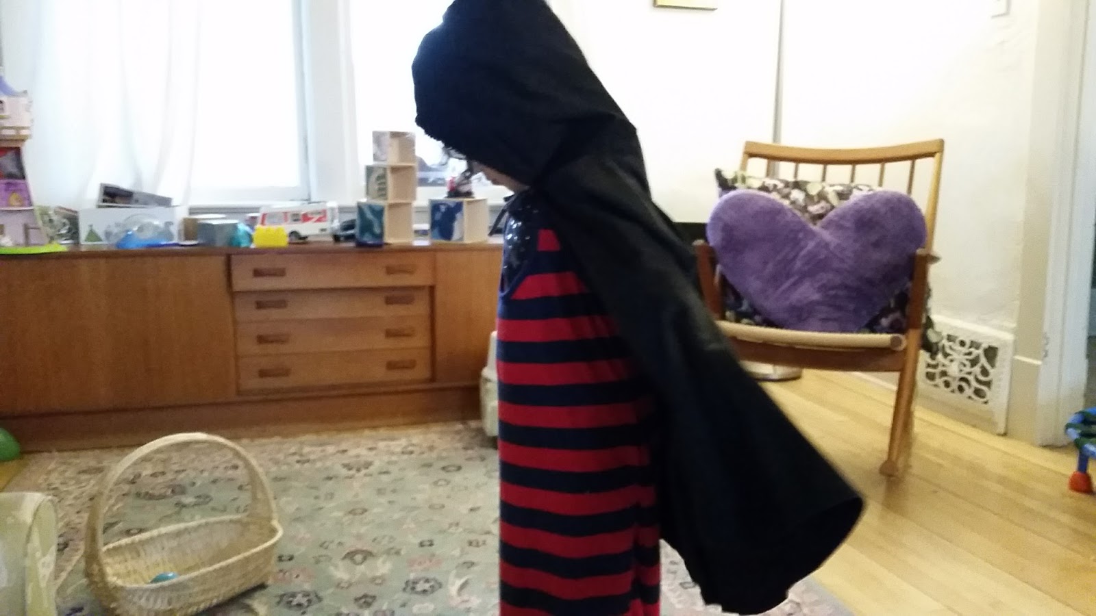 I used a bit of scrap fabric to make the hood, and just added ties made out of T-shirt yarn to fasten at the collar. Luckily the skirt was already the perfect cape length and the fit was perfect for tapering at the shoulders once I chopped the waistband off.  The whole thing took about 20 minutes.