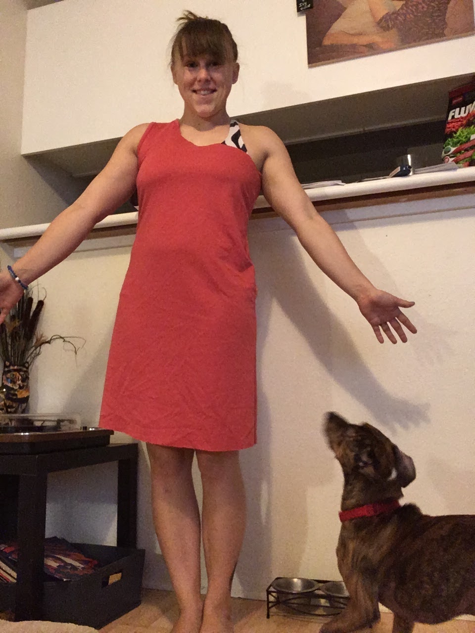 I started with this pink dress and some placemats. I found a dress on Pinterest that I liked a lot so figured I'd try my hand! It was a one strap off the shoulder dress so I measured with a shirt I already had and off went a sleeve!