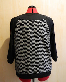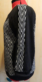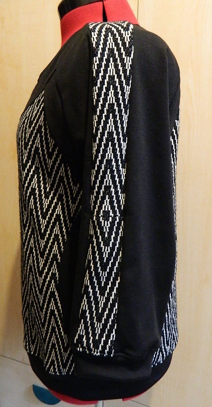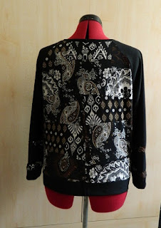 J'ai utilisé du jersey noir pour faire les manches et je dois dire qu'il ne reste plus rien du tout de la tunique, j'ai tout utilisé même la ceinture qui a servi à faire de petits rappels de l'imprimé sur le bas des manches.