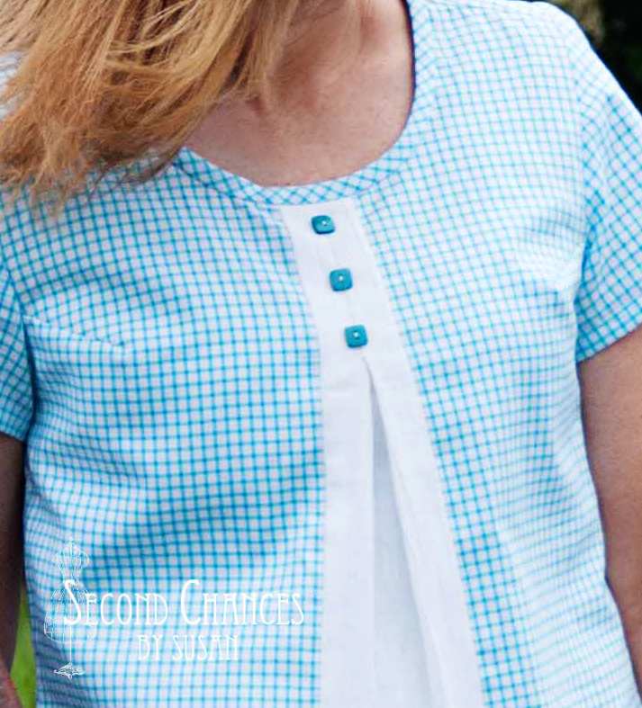 I added a few square buttons that mimicked the check in the fabric. To finish the tunic, I cut off some of the length and added a new shirt tail hem.